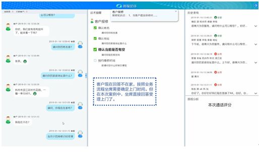 如果我们需要转人工服务,也可以跳转过来。在一些简单的维修预约流程,智能客服助手就可以实时、手把手地帮助客服人员回答服务诉求。这里客服是新人,所以智能客服助手在服务过程中会提醒他各种话术。右侧是质检画面,实时质检服务情况。案例中,客服人员最后没有问客户预约时间,质检出来是本次服务的缺失。我们让一个新人使用智能客服助手,就可以勉强把一个陌生业务做下来。人机融合的方式能够很好地帮助很多客服中心提升效果,当然功能还需要配置得更强大。