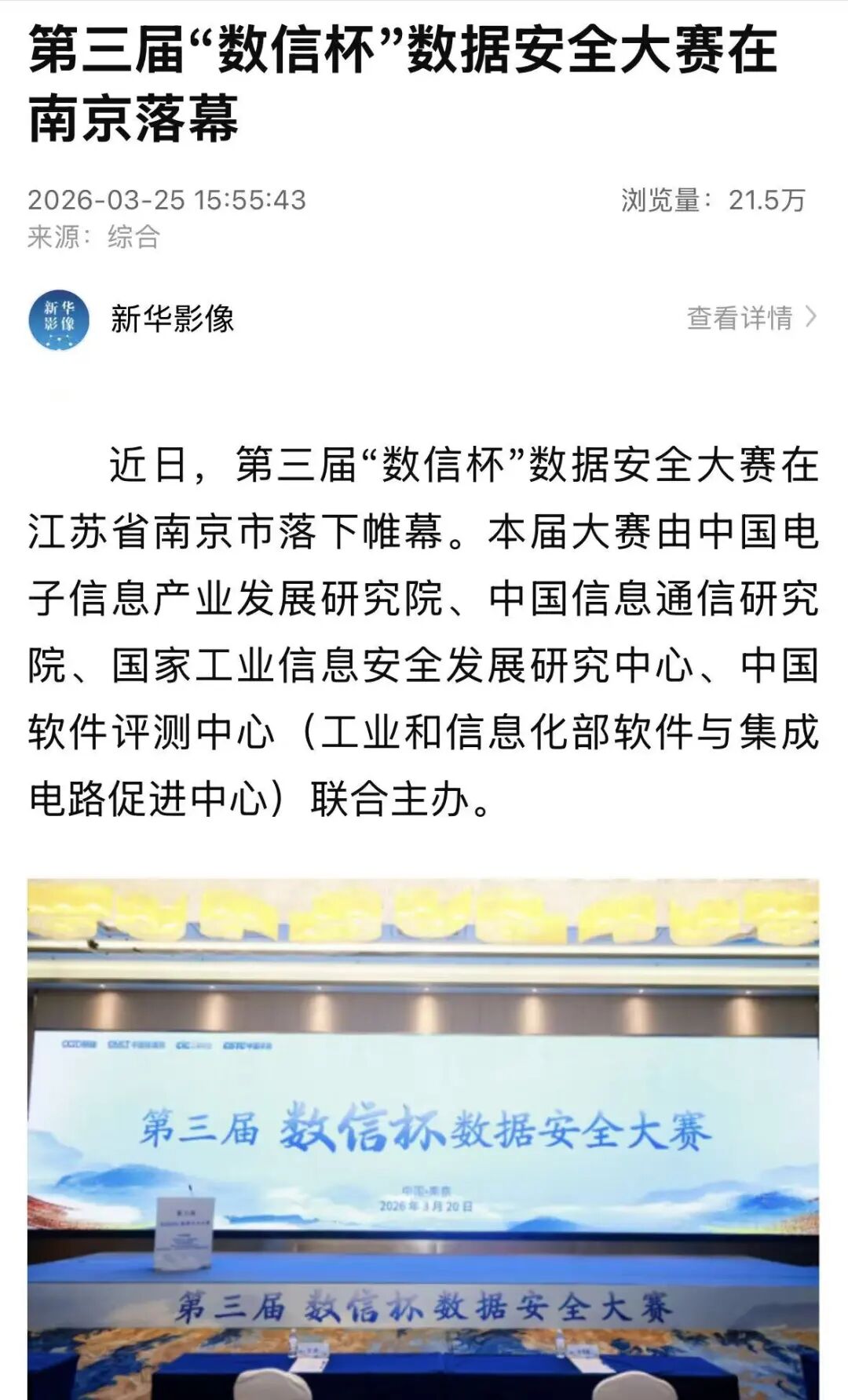 3月20日,由中国电子信息产业发展研究院、中国信息通信研究院、国家工业信息安全发展研究中心、中国软件评测中心四大国家级机构联合主办的第三届 “数信杯” 数据安全大赛在南京圆满落幕。作为国内数据安全领域的标杆赛事,本次大赛汇聚电信、金融、政务、工业等关键领域 4000 余名选手、近 200 项优质案例同台竞技,评审兼具权威性、专业性与行业前瞻性,是对企业技术实力与行业服务能力的全面考验。